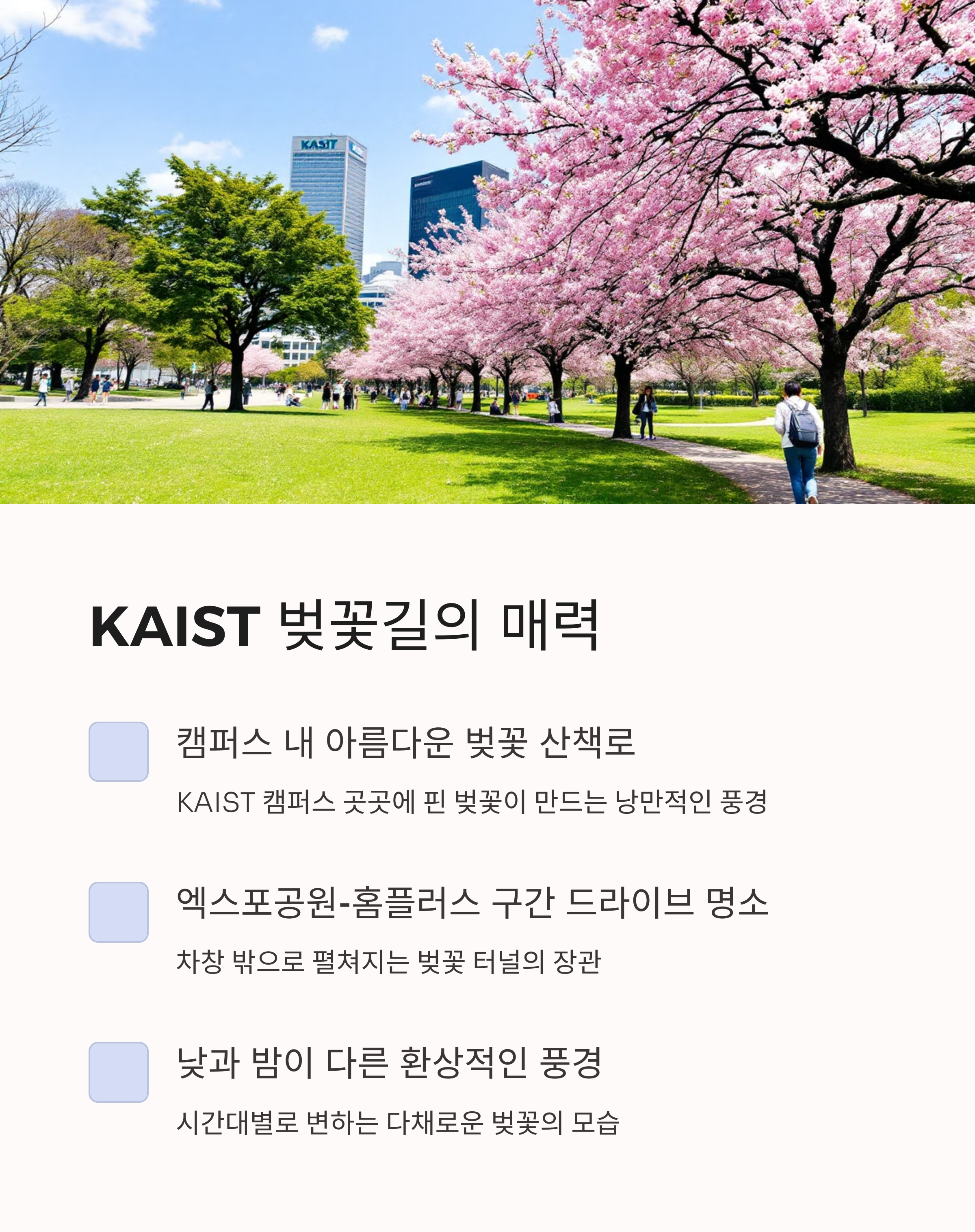 | 벚꽃 명소 | 카이스트 캠퍼스를 따라 펼쳐지는 벚꽃 명소 |