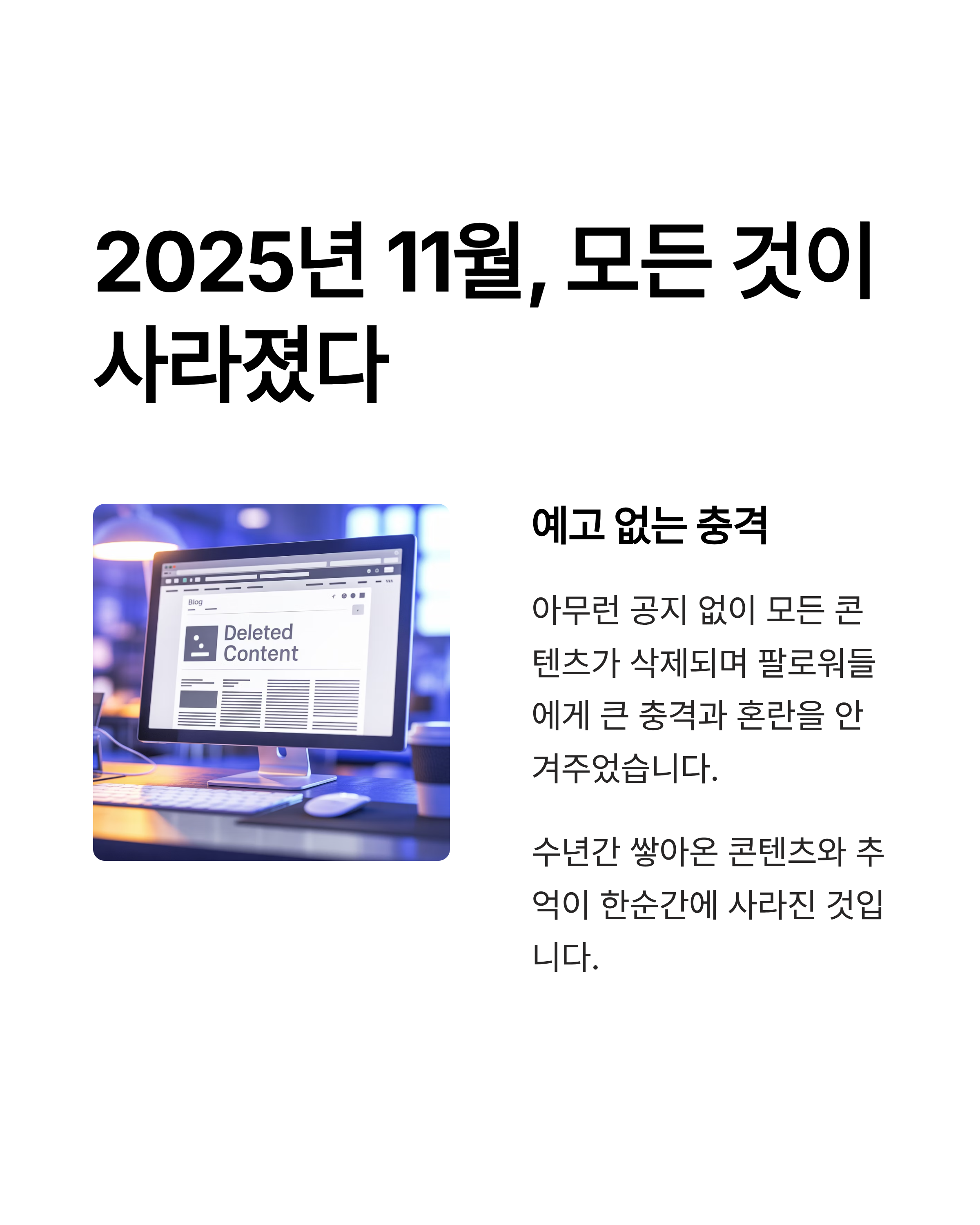 지금 이 순간에도 우리는 SNS, 블로그, 카페 등에 하루에도 여러 번 글과 사진을 남기고 있습니다. 이번 일을 계기로 한 번쯤은 내 계정 보안, 백업 습관, 정보 소비 태도를 점검해 보는 것도 좋겠습니다.