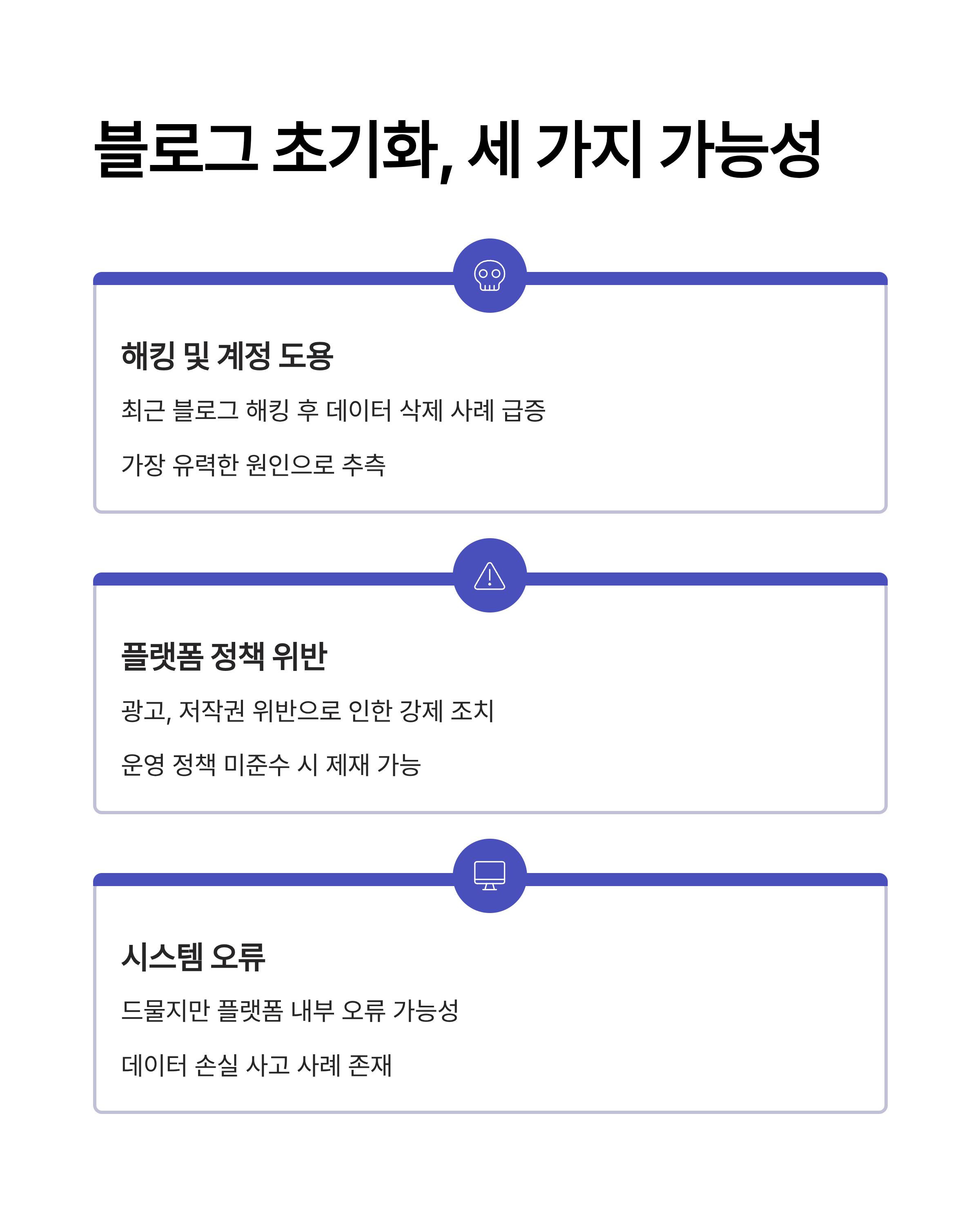 정확한 사유는 본인 외에는 누구도 알 수 없지만, 일반적으로 블로그 계정이 한 번에 초기화되는 경우에는 다음과 같은 가능성이 주로 거론됩니다.