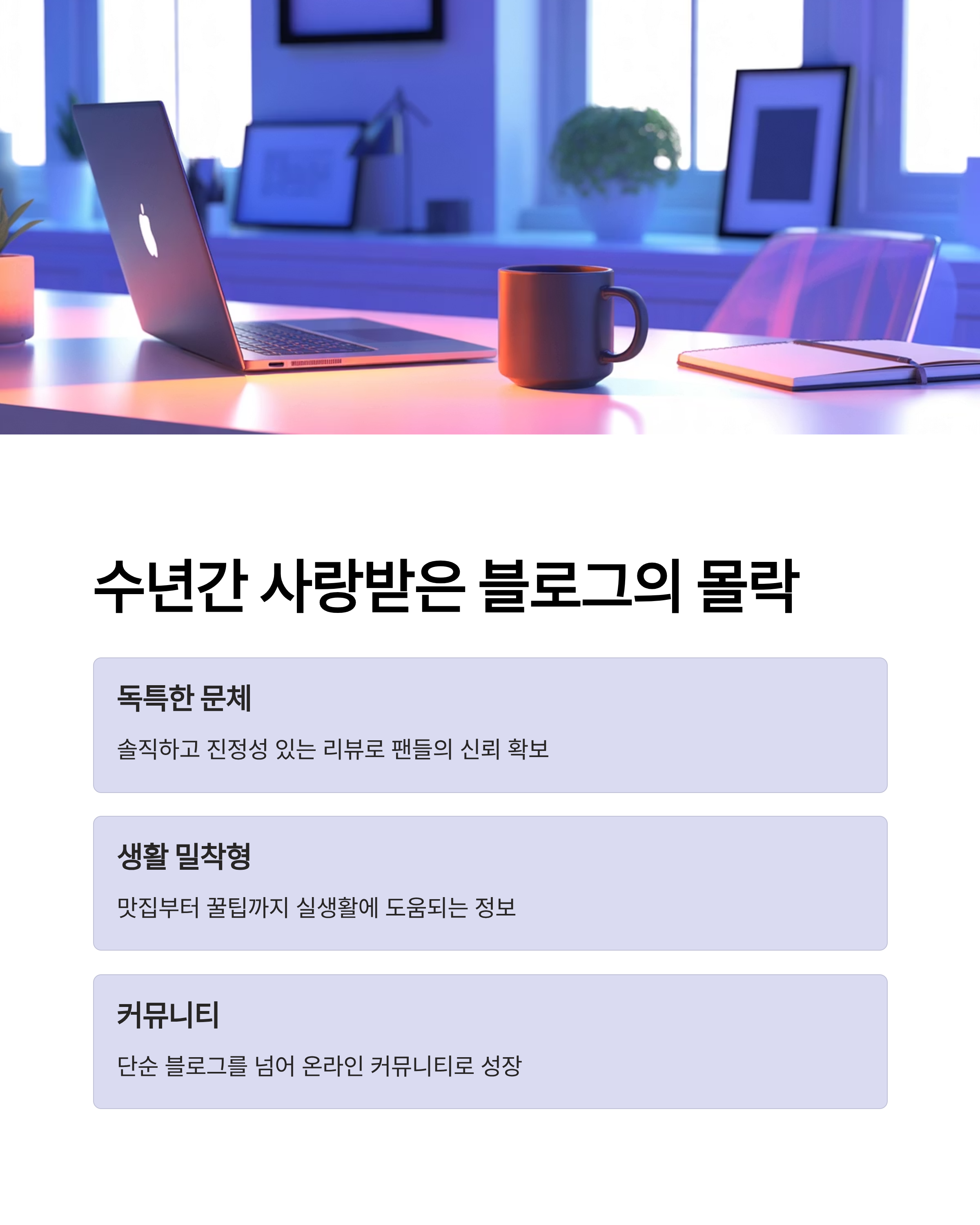 블로그는 플랫폼 회사의 서버 위에 얹혀 있는 공간일 뿐, 궁극적으로 나의 기록은 내가 따로 관리해야 한다는 점을 잊지 않는 것이 중요합니다.